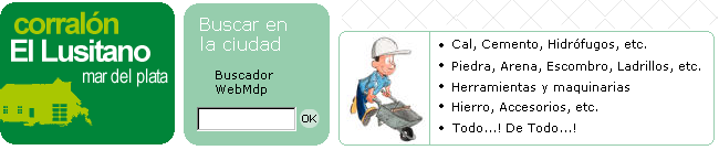 Corral�n EL LUSITANO //// MATERIALES PARA LA CONSTRUCCI�N //// Cal - Cemento - Arena - Hierro - Ladrillos Cer�micos y Comunes - Art�culos de Ferreter�a - Electricidad y Sanitarios >>> Ladrillos Palmar, ladrillos Coyunco, ferreter�a, pinturas, tarjetas de cr�dito >> No deje de visitarnos...